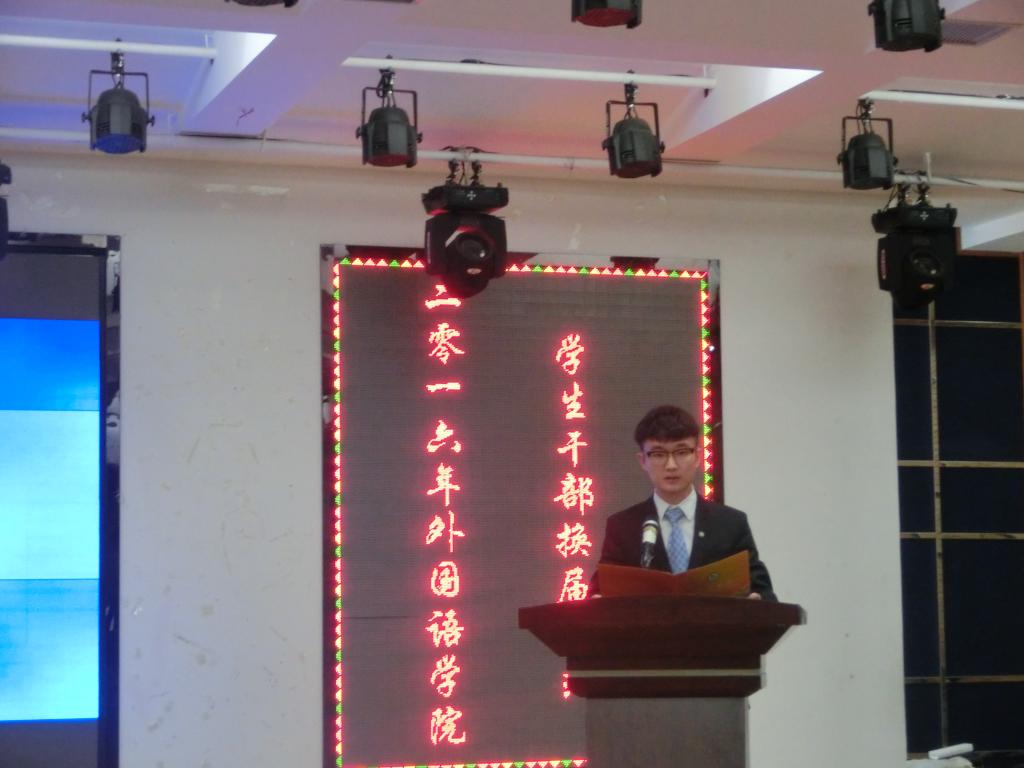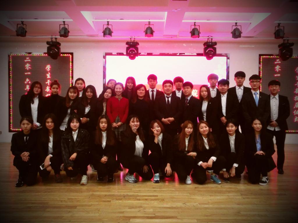 2016年学生干部换届仪式在二食堂三楼小剧场顺利举行。学院学生工作办公室裴香花主任、团委金春宪书记以及各专业辅导员出席了本次大会。本次换届仪式由学院十三届学生会主席朴泰禹主持。