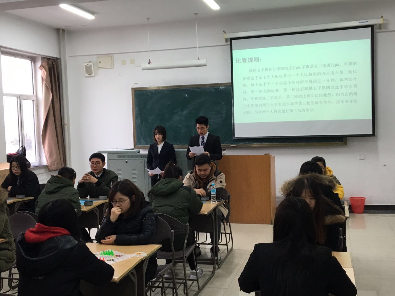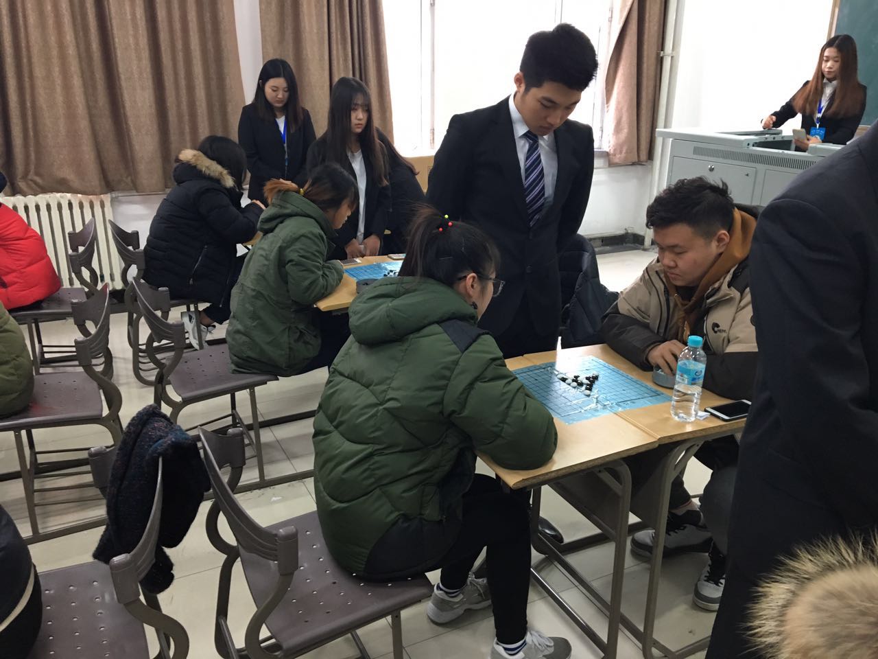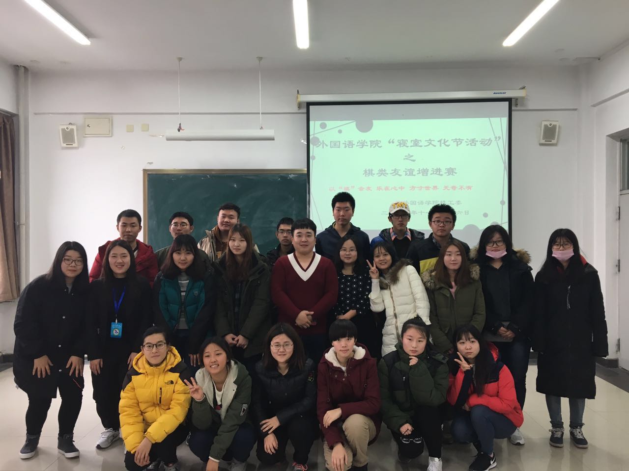 经过寝室内部,各寝室之间及预赛的层层选拔,本次决赛共有23名来自不同寝室的选手参加。经过第一轮淘汰赛,现场气氛逐渐活跃起来,五子棋,跳棋及军旗各晋级四名选手。第二轮的半决赛中选手们也都展示了自己的高超棋艺,每一步都沉着冷静地思索,现场气氛不禁更加紧张起来,经过激烈的比拼之后,共六名选手进入最后的决赛。第三轮,夺冠的最后比拼,现场气氛到了最为紧张的时刻,选手们走棋也更为慎重了。经过近一个小时的激烈角逐,终于尘埃落定,最终由2015级英语专业高航获得五子棋第一名,2016级英语专业严莉娜获得跳棋第一名,2014级俄语专业杨睿琨获得军旗第一名。活动最后郭鲜丹老师对此次比赛做了简单的总结和点评,点评后参赛选手和老师们合影留念,至此比赛圆满落下帷幕。