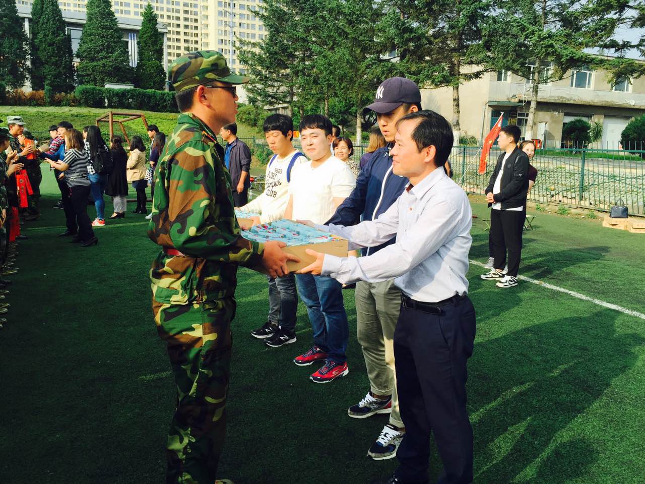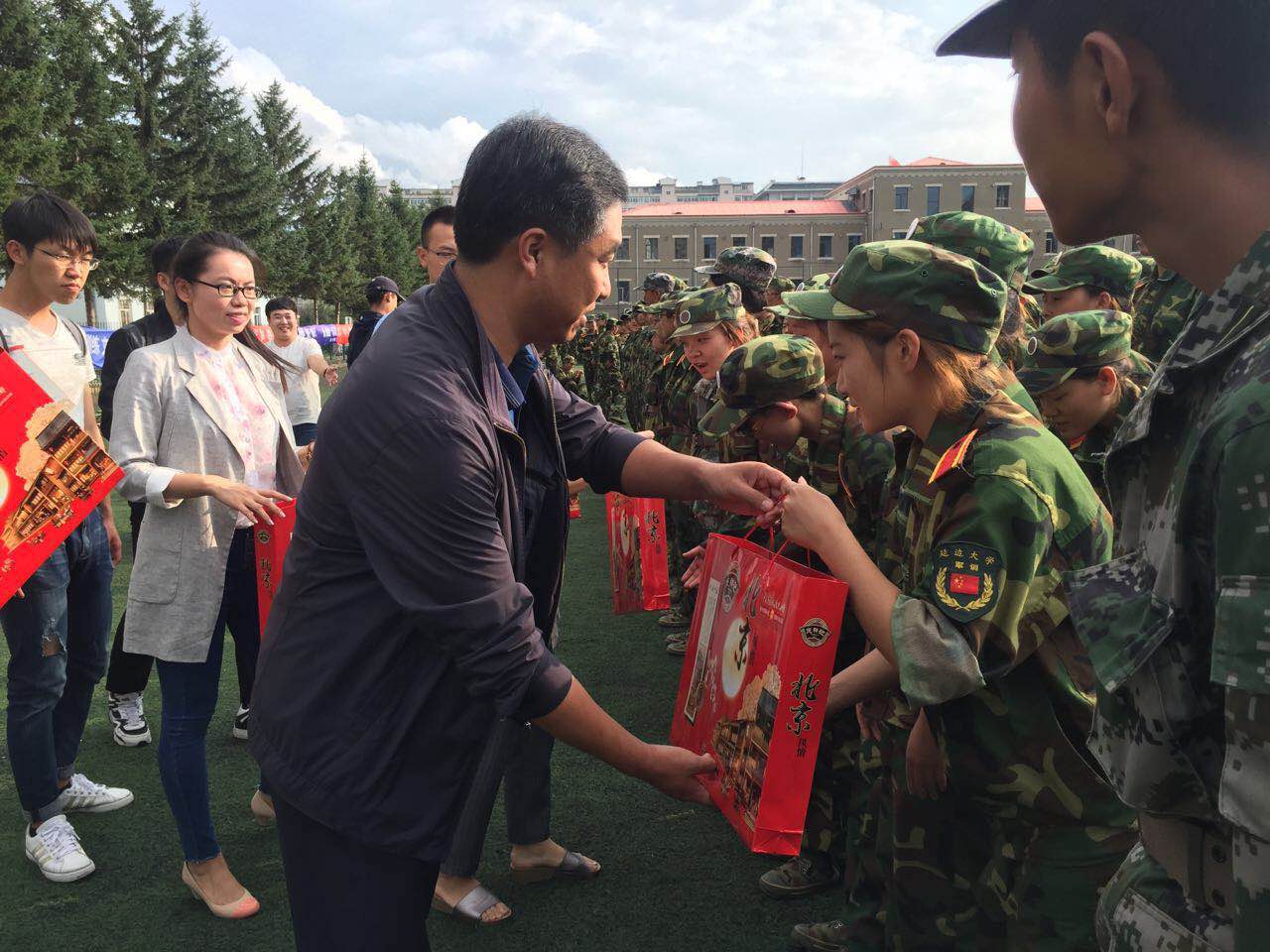 裴香花主任首先向2016级新生们介绍了到场的党政领导。接着,学院党委赵亮书记进行讲话。赵亮书记对认真指导新生的教官及积极训练的新生们表示感谢。赵亮书记预祝新生们军训取得圆满成功,并祝新生们中秋节快乐。随后,学院郑鲜日院长发表讲话。郑鲜日院长希望新生们把学院当成家,希望新生们能尽快适应大学生活,把身边的人当作亲人,度过一个美好的中秋节。院长讲话后,学院及各专业领导为教官及新生们发放月饼,并对新生们表示亲切慰问。本次活动圆满结束。