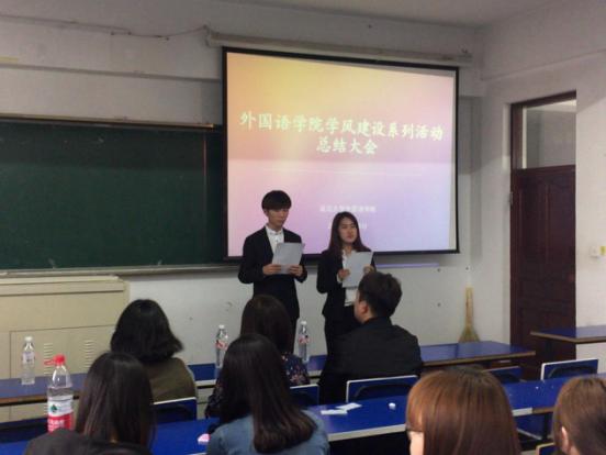 学生工作办公室主任裴香花老师、团委书记金春宪老师、日语专业辅导员郭鲜丹老师、俄语专业辅导员严文颖老师出席大会。大会由楼工委成员金龙辰以及赵鑫宇主持。首先由楼工委播放视频,回顾上一次的寝室文化节,随后两位主持人分别就学风建设活动的开展的目的以及意义进行了介绍。其次宣读了获奖名单然后请出席大会的各位老师进行颁奖。最后学院学生工作办公室主任裴香花老师在会上讲话。裴香花主任对为期一年的学风建设活动及学生工作进行了全面总结,肯定了在过去一年里我院学风建设活动取得的发展,同时也希望我们能够继续发扬。