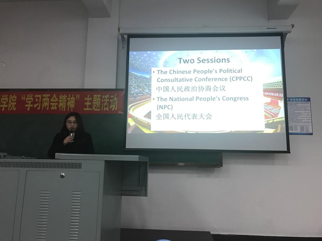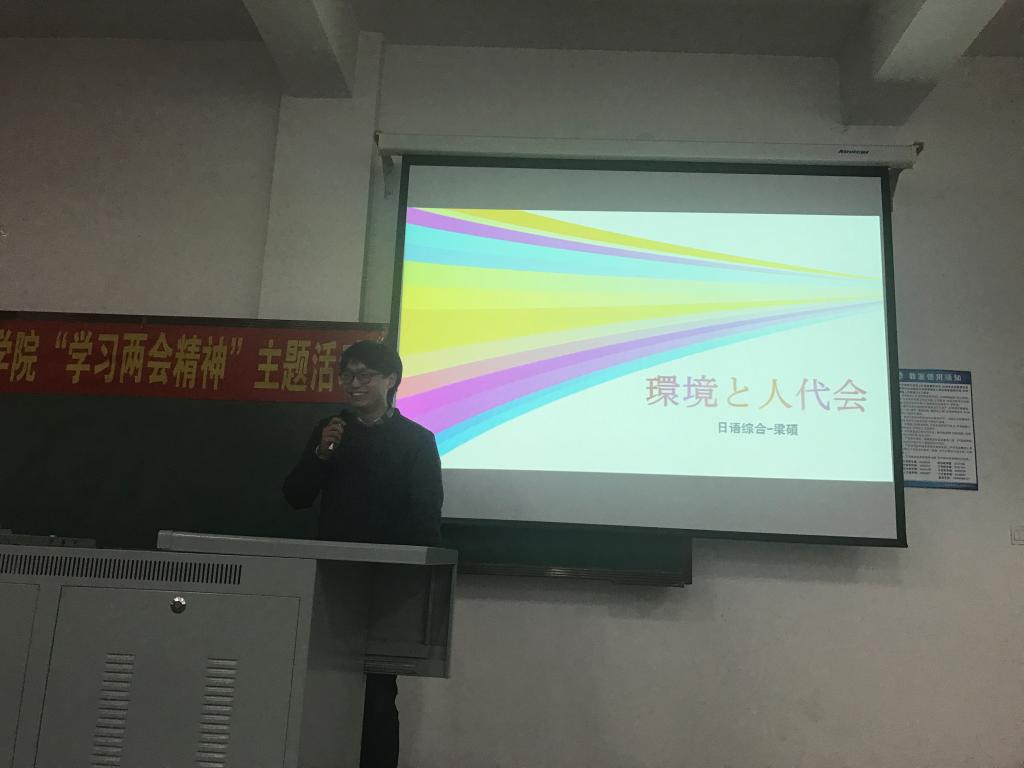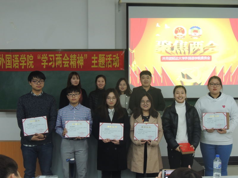 伴随着令人振奋的国歌声,本次活动正式拉开帷幕。随后,主持人介绍了两会热点问题,并播放两会相关视频,进一步增强大家对两会精神的理解。为突显我院特色,本次活动采取各专业以本专业语言发表自己对两会的看法的形式进行,英语专业代表杜梓倩同学、杨硕同学,日语专业代表梁硕同学、崔玉莲同学,俄语专业代表刘可染同学、李周娜同学分别以本专业语言发表了演讲,获得了同学们的一致好评,随后郭鲜丹老师对两会内容进行深入分析,为同学们讲解两会举行的意义并进行总结 ,在活动的最后,参加本次活动的各位老师为发表演讲的同学颁发证书及奖品,并进行合影留念。