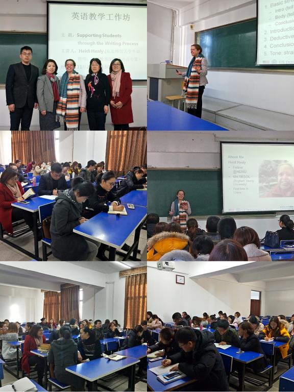 共同邀请美国英语语言专家、东北师范大学外籍教师Heidi Healy女士于2017年11月29日在综合楼515举办了以“Supporting Students through the Writing Process”为主题的英语写作教学工作坊。本次工作坊采取模拟课堂的小组讨论形式进行。我院英语教师和研究生参加了此次活动。