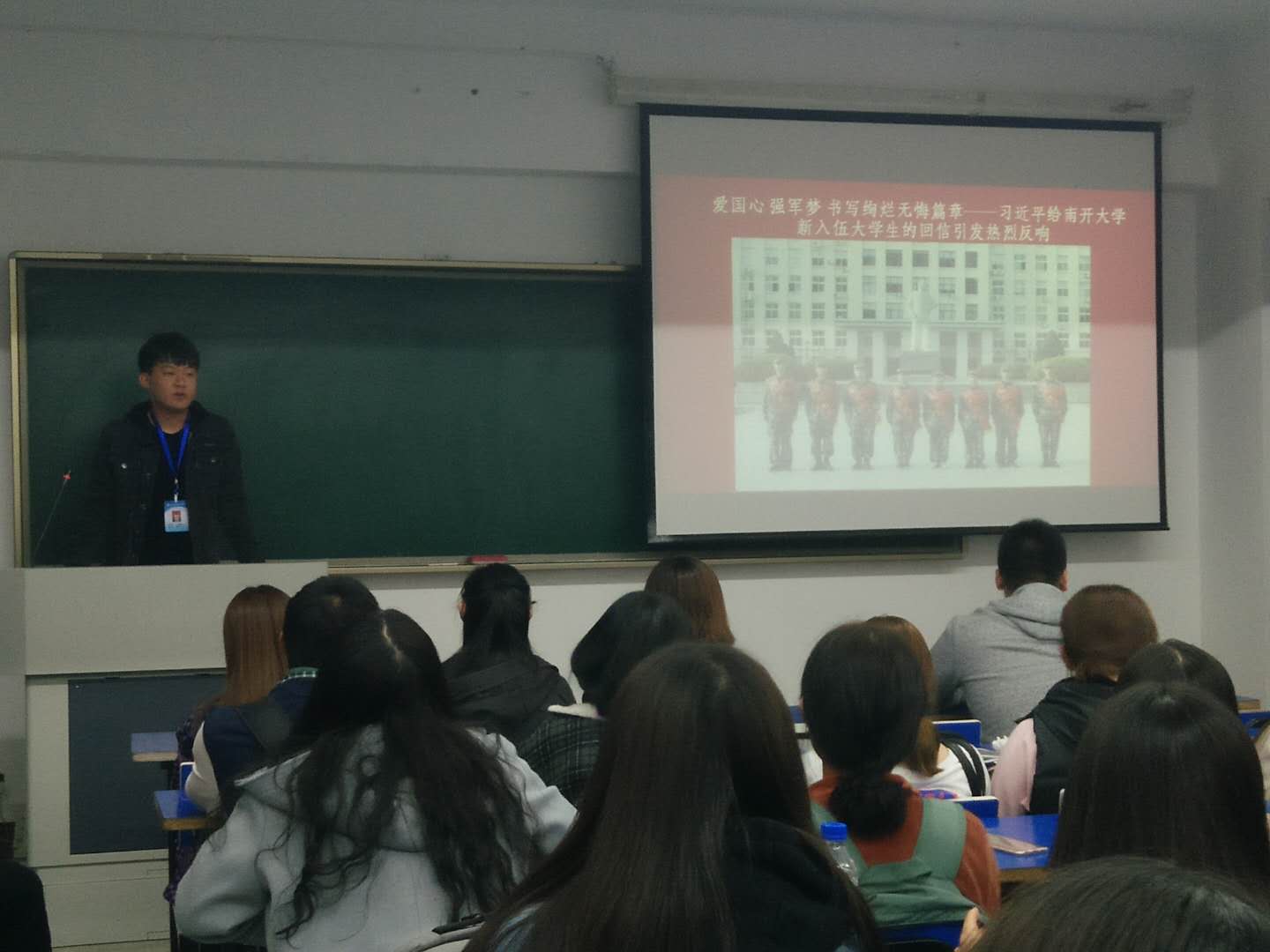 首先,由团委副书记单强为大家介绍八位应征入伍南开学子的相关信息,他们中,有的是新疆反恐烈士的儿女,有的是抗美援朝老兵的后人,既有城市青年,也有农家子弟。即将奔赴军营前夕,这八名大学生给习近平总书记写信,表达了他们献身国防和军队建设,为实现强军目标、建设世界一流军队作贡献的坚定决心。随后大家观看了习近平总书记给八位学生的回信,回信中表扬了这八名南开学子响应祖国召唤参军入伍,为广大有志青年树立榜样的品质,并希望他们能够珍惜身穿戎装的机会,把热血挥洒在实现强军梦的伟大实践之中,在军队这个大舞台上施展才华,书写绚烂、无悔的青春篇章。在活动的最后,由副书记单强做出总结,指出作为新时代大学生的我们,更要积极响应党和国家的号召,响应习近平总书记强军目标、建设世界一流军队的召唤,积极投身于国防建设。要像习近平青年时代那样,不怕磨练,献身国家,让青春唱响信仰之歌。
