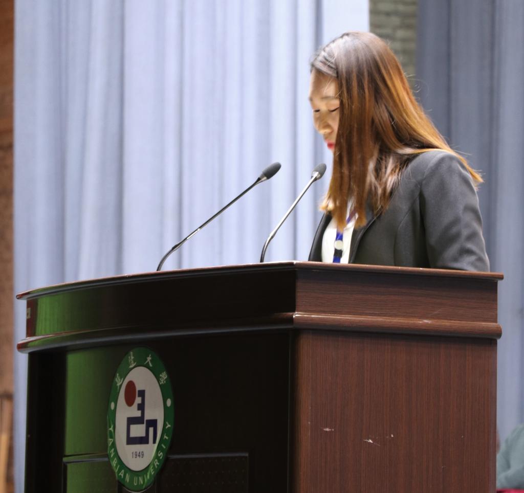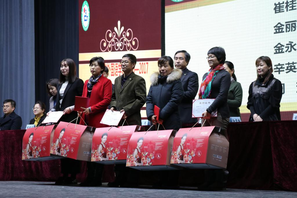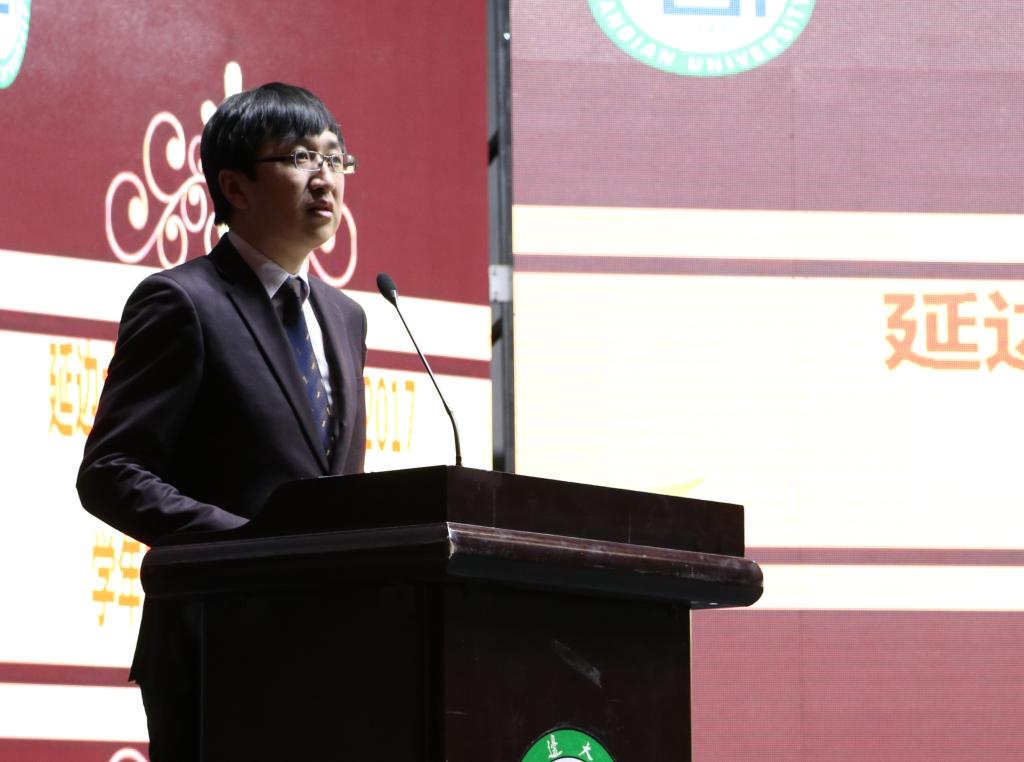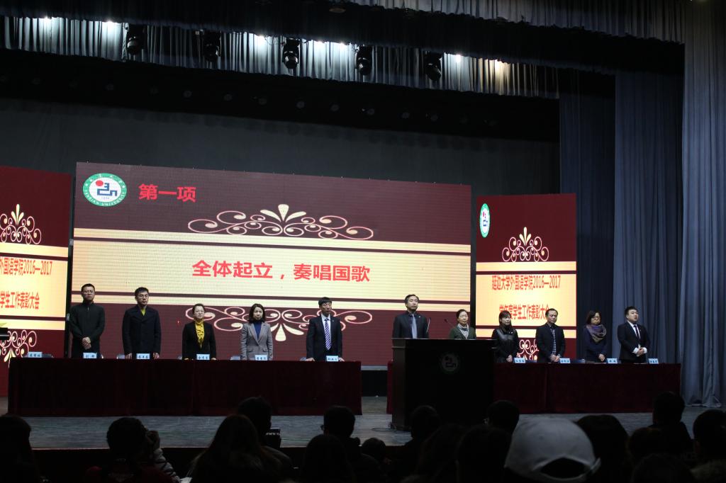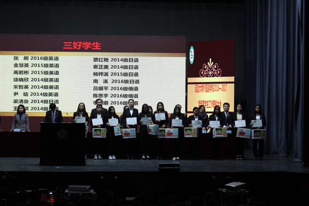 2016—2017学年度学生工作总结表彰决定》。接下来,与会领导们为获奖的老师及同学们颁发荣誉证书及奖品。之后,2015级英语专业高若彬同学代表全体获奖同学发言,感谢学院老师们一直以来的支持与鼓励,号召同学们以更坚定的信念,更昂扬的精神状态面对未来的挑战,不辜负学院老师们的殷切希望。随后,学院党委赵亮书记总结讲话,书记首先对过去一年中学院的各项工作予以肯定,同时也希望同学们不忘初心、牢记使命,积极承担历史的重任;希望大家志存高远脚踏实地,牢记“明德博学,多元并蓄,会通中外,笃行志远”的院训;谨记“求真,至善,融合”的校训,发扬艰苦奋斗精神,为学校争得荣誉。最后,大会在《搜同