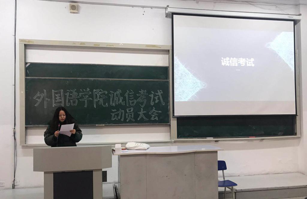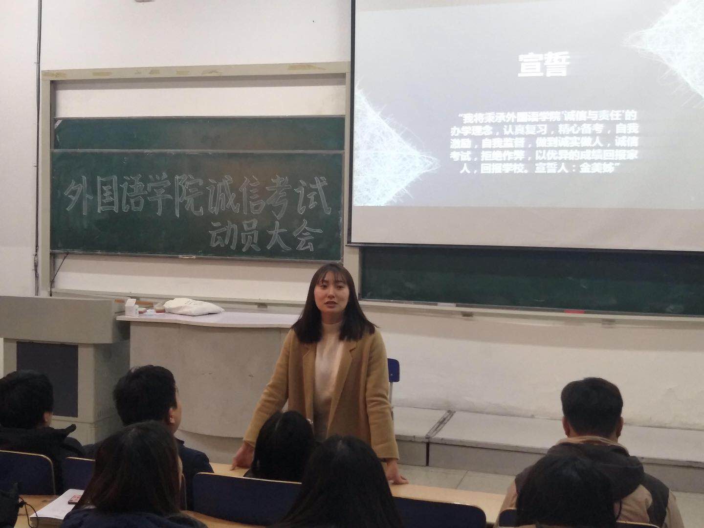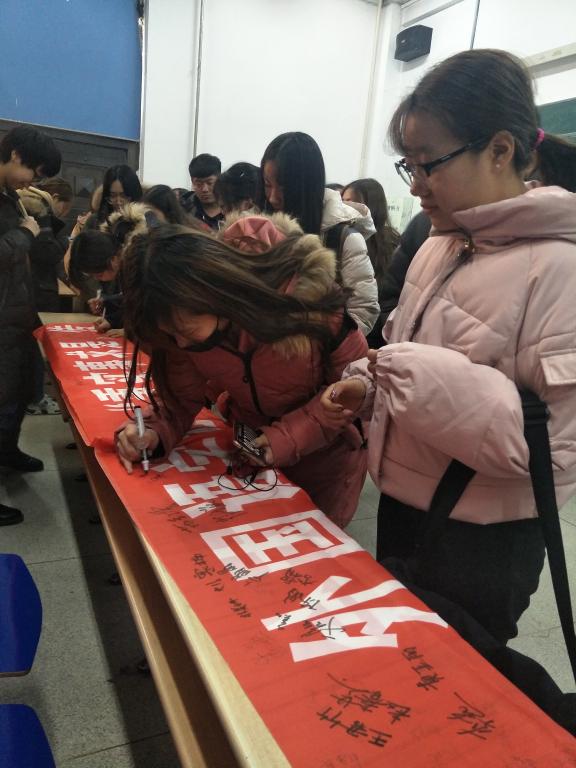 活动伊始,2016级英语专业张昶同学为大家讲解了诚信考试的重要性,并对学生手册中关于考试作弊的相关处分进行了说明,呼吁同学们认识到作弊的严重性并严肃对待考试。接下来,由2017级英语专业金美姊同学带领全体同学做诚信考试宣誓。随后在学生会的组织下,同学们在诚信条幅上签字,大家纷纷表示在接下来的考试中会严格遵守校规校纪,诚信应考。最后,周沫老师做总结讲话,对考试中应注意的事项进行了进一步的说明,并鼓励同学们认真复习,取得好成绩,争取为一学期的学习画上圆满的句号。
