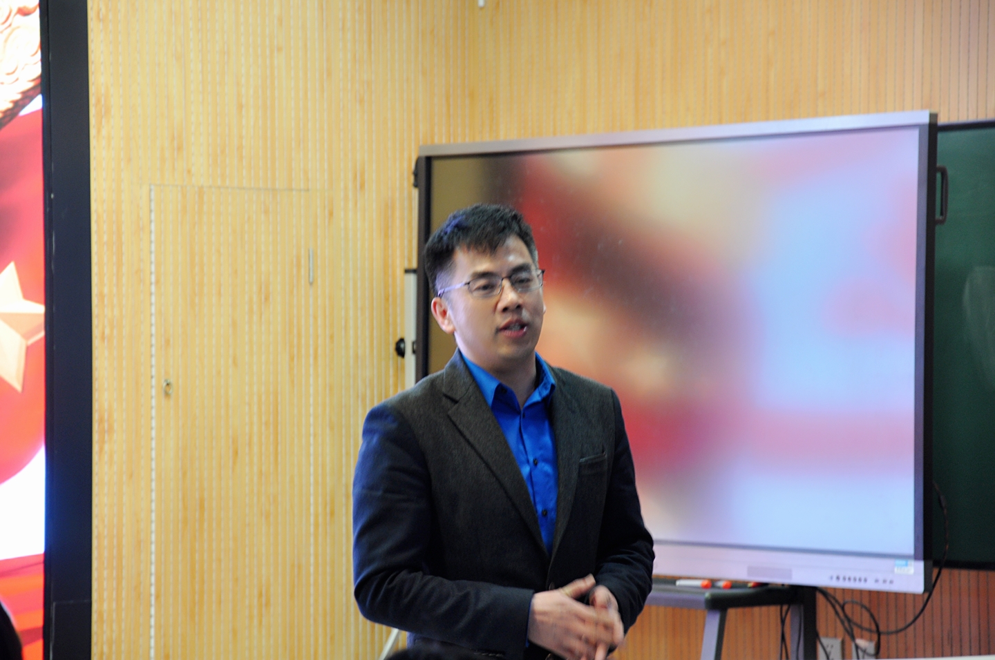 在主持人简单介绍了安丰存书记以及金春宪主任之后,活动正式开始。首先,安丰存书记表达了对专业学生会及团总支邀请的感谢,随后表示大学生,尤其是英语专业的学生更应关心政治,承担使命,在国际舞台上发出中国的声音。紧接着,15级王印同学为大家进行两会热点词汇的英文解读。通过其详细的解读,同学们了解到了“决胜全面建成小康社会”等热词的英文表达及深层含义。在最后的有奖问答环节,同学们的积极发言更是把本次活动推向了高潮。最后,金春宪主任对本次活动进行了简要的总结。