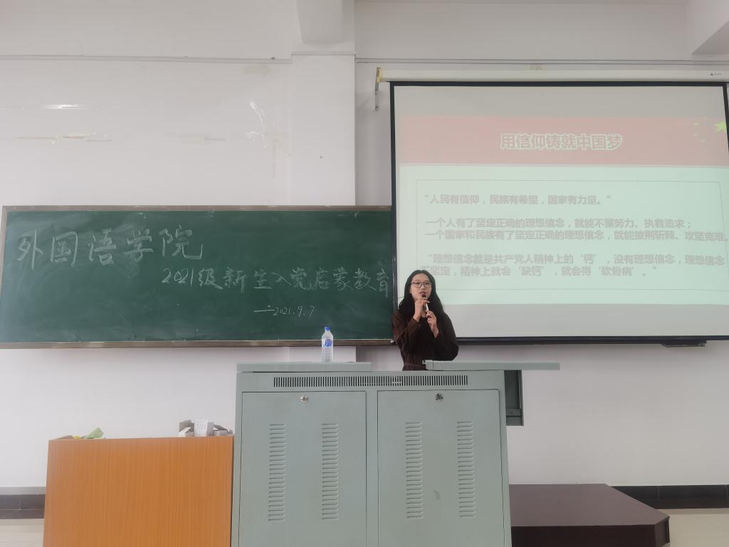 于2021年9月7日上午10点在勤学楼203教室开展了2021级新生入党启蒙教育活动。本次讲座由俄语专业辅导员孙小涵主持,学院党委裴香花副书记主讲。