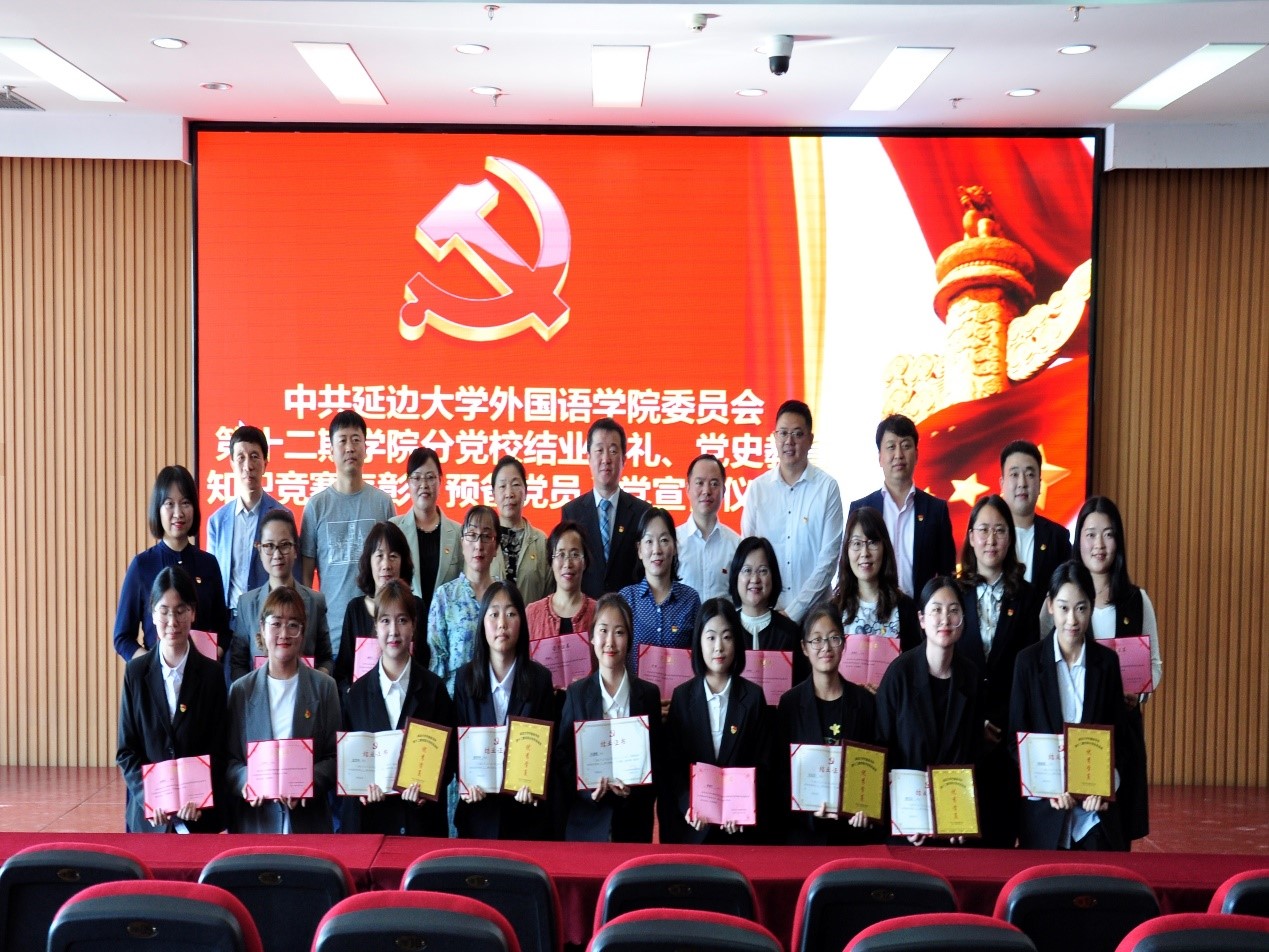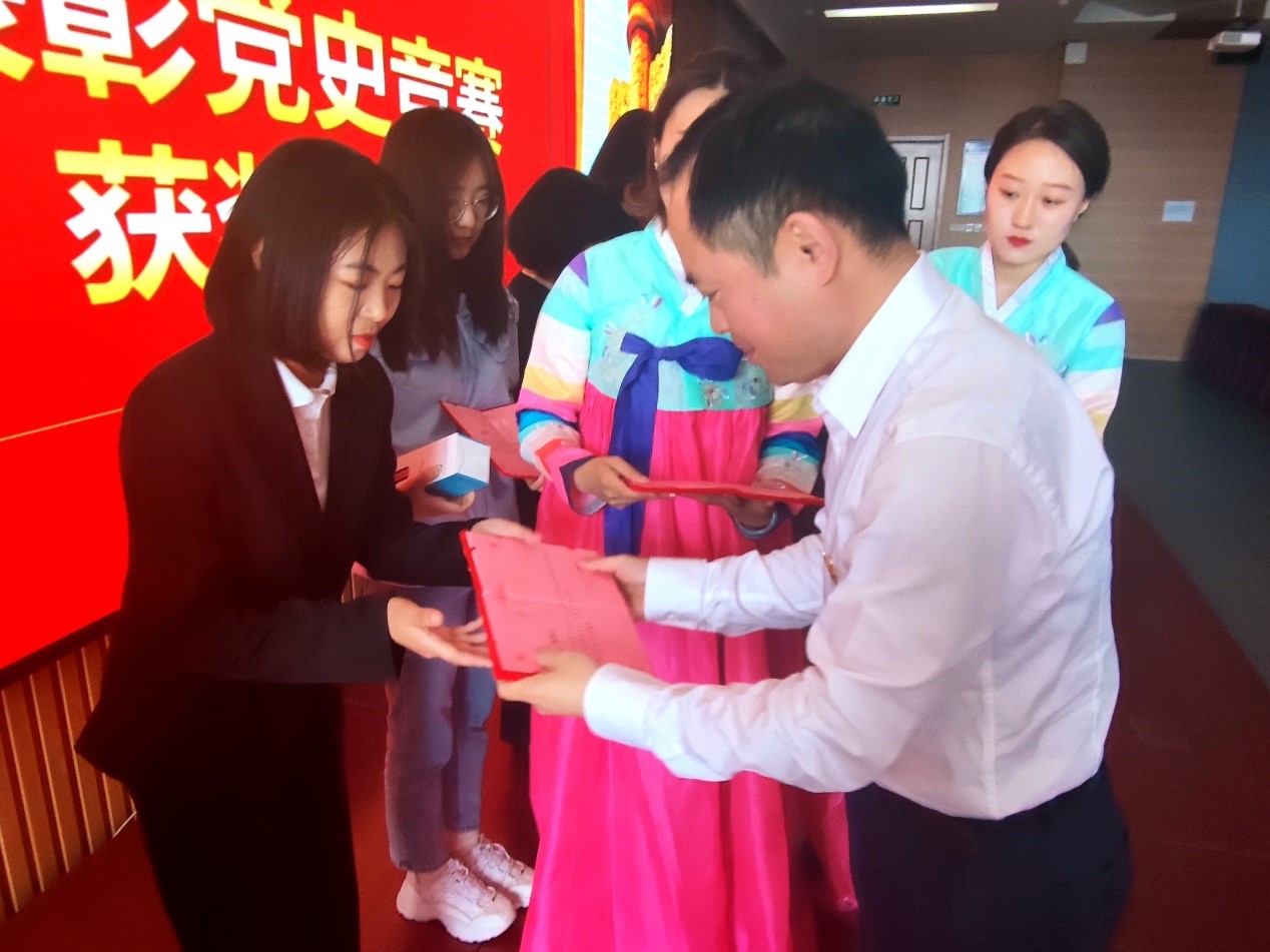 分党校优秀学员以及“学党史、悟思想、办实事、开新局”庆祝建党100周年党史学习教育知识竞赛获奖人员的决定。随后,由全永男书记向学院分党校优秀学员颁发了奖牌和奖品,并由孙盛梅同学作为优秀学员获奖代表发言。接下来,由关心下一代委员会主任刘文、大学外语部党总支书记裴英玉、英语专业党总支书记金明浩分别为党史竞赛活动的第一名、第二名、第三名获奖人员颁发奖品。接下来,由李仁哲主任宣读了《批准中国共产党预备党员通知书》及参加入党宣誓的74名预备党员名单,所有预备党员由入党培养人为其佩戴党员徽章并在申文成同志的带领下向党旗庄严宣誓。紧接着,由预备党员代表郑胜利同志发言,她首先感谢学院对其的辛勤培养,并表示一定会更加努力提升自己,向着早日成为一名光荣的共产党员而努力。最后,由全永男书记作总结讲话,他对新一批的预备党员表示了鼓励,并希望他们能够不忘初心,继续砥砺前行,不懈奋斗,早日成为一名合格的党员。