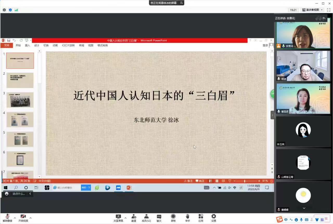 邀请东北师范大学日语系教授,博士研究生导师,兼任中国日语教学研究会副会长、中华日本学会常务理事、中国日本史学会常务理事、北京大学东北亚研究所客座研究员、吉林省外语学会副会长,徐冰教授作了题为《近代中国人认知日本的“三白眉”》的精彩讲座,会议由搜同